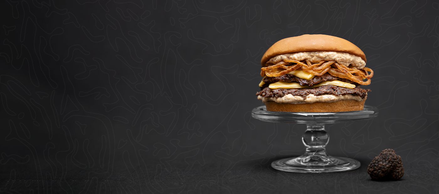 Pan de papa, carne smash, queso danbo, cebolla crispy y black truffle sauce. Incluye porcion de papas con queso parmesano rallado.