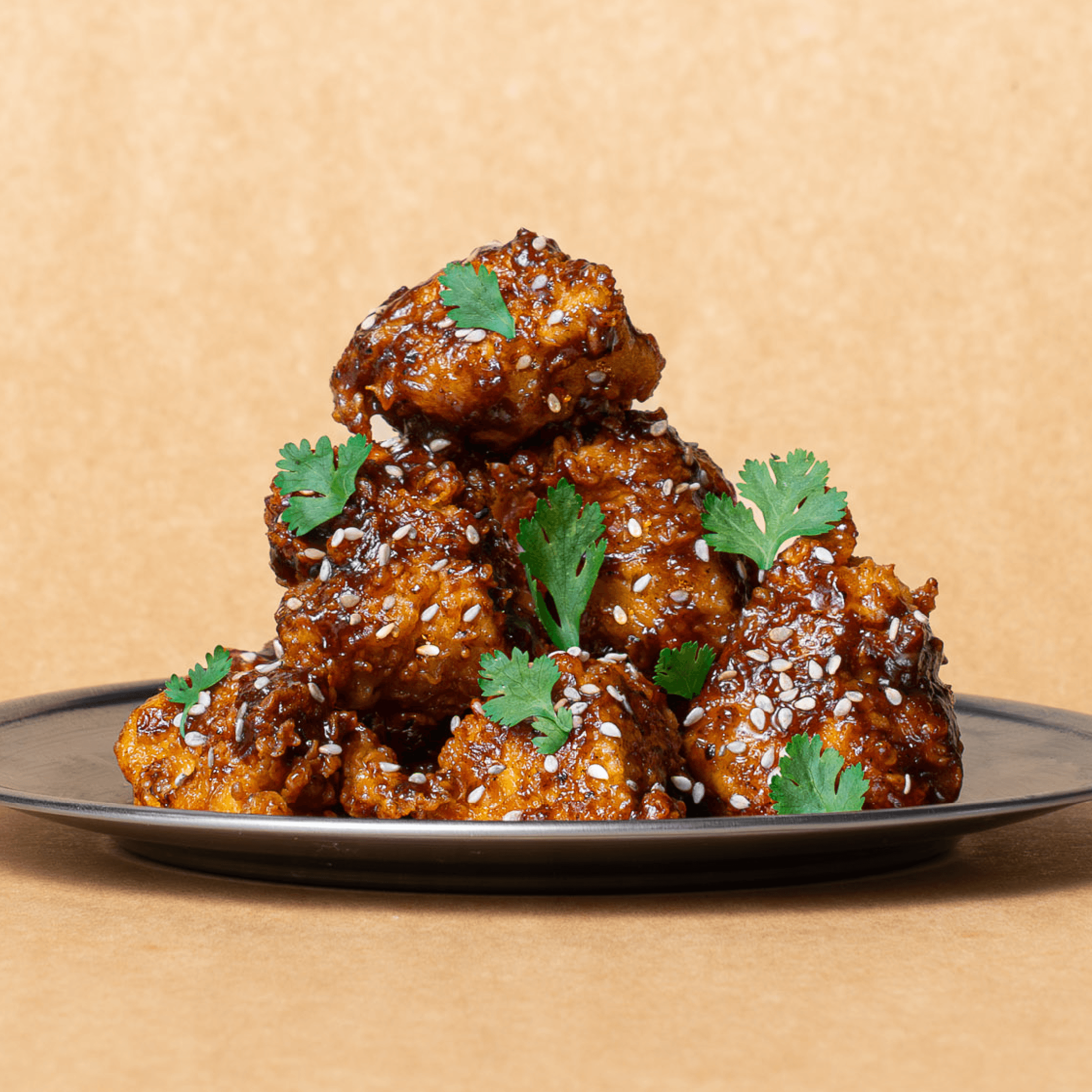 Piezas de pollo crispy, semillas de sesamo, cilantro y salsa yeca.